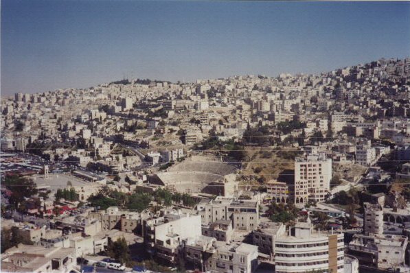 ![]() Amman (viewed from the citadel). Town planning laws say that every building must have at least 3 sides faced in white stone. Note the Roman theatre |