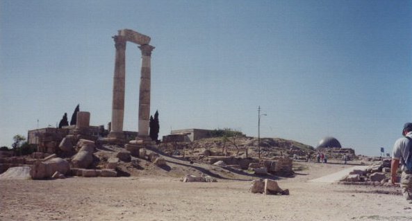 ![]() On top of the Citadel. The collumns are almost all that remain of the temple of Hercules. Note the restored roof of the Ummayed Palace in the background |