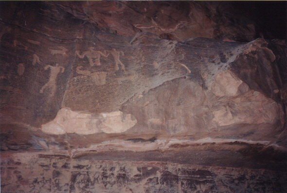 ![]() Pictures which people had carved into the rock, again near where water was available. This was at a height which, in the previous photo would have been several feet above our heads. the people who carved it, did so at about chest height and the ground below has since been lowered by erosion. |